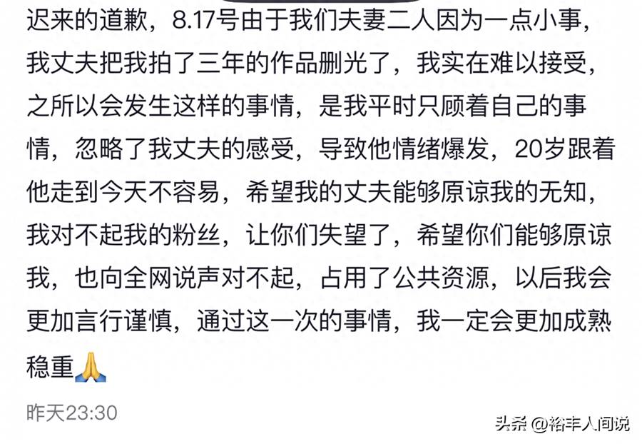 總結這則官宣文案,大體的意思就是:我與老公并沒有發生真正的爭吵,所謂的吵架不過是劇本而已,之所以道歉,是因為我還想讓大家支持我,我還想賺大家的錢。