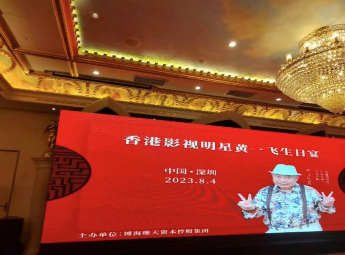 從曝光的畫面中能夠看出,酒店內裝著水晶燈,金碧輝煌,看起來非常豪華。舞台屏幕上還用紅底白字寫著「香港影視明星黃一飛生日宴」,并配上了黃一飛雙手比「V」的照片。