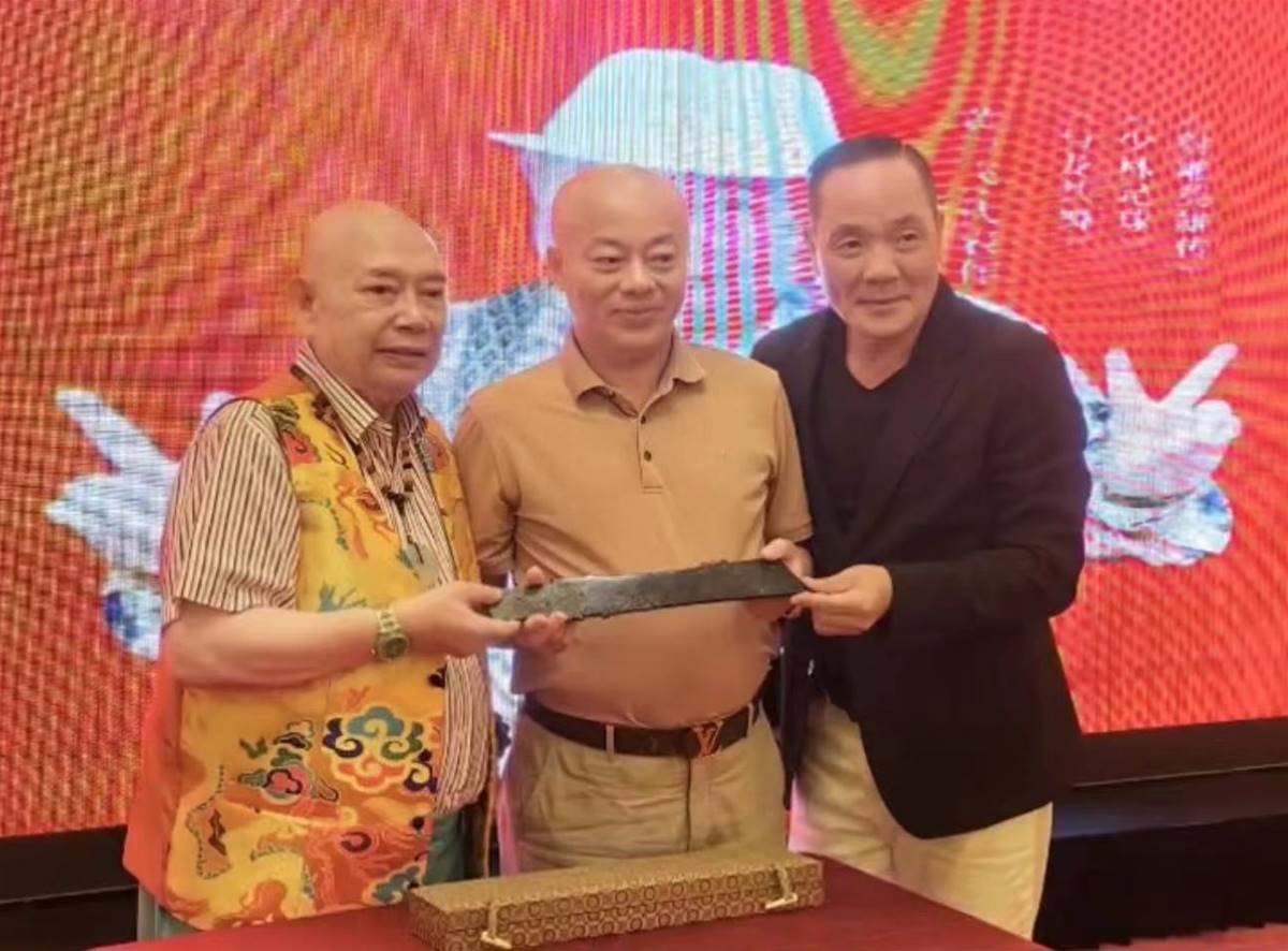 此外,兩人還一起在台上捧著一個鐵質古董合影,似乎是某位富商送給黃一飛的生日禮物。