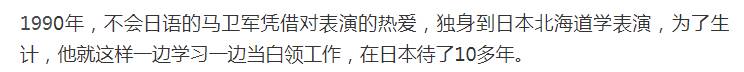 也是在這里他認識了自己的妻子,妻子雖然在日本,但本身是中國人,只是後來才入籍日本,所以兩人在日本相知相遇,并且生下了兒子,但這一切隨著馬衛軍的回國而發生了變化,因為馬衛軍在日本的表演事業并沒有很好,所以49歲時他果斷選擇了回國。